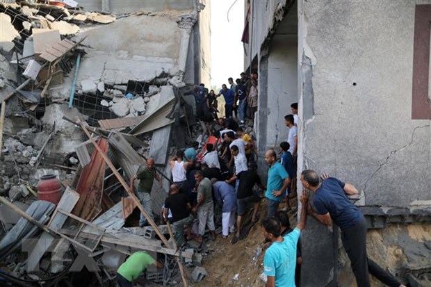 Người dân tìm kiếm người bị mắc kẹt trong những đống đổ nát sau vụ không kích của Israel tại Khan Younis, Dải Gaza, ngày 11/10/2023. Ảnh: THX/TTXVN |
