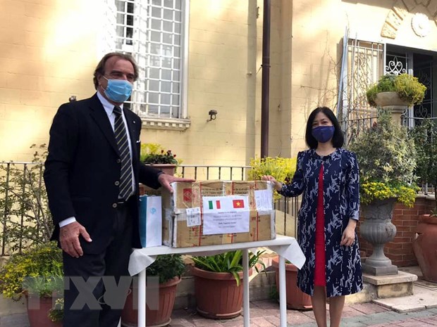 Đại sứ Nguyễn Thị Bích Huệ cho biết Chính phủ Việt Nam đã tặng Italy hơn 100 nghìn khẩu trang, các doanh nghiệp, tổ chức, cá nhân ở Việt Nam tặng Italy 23.000 khẩu trang, 500 bộ đồ bảo hộ và 400 màng chắn mica. Cơ quan Du học Italy tại Việt Nam và Hội Hữu nghị Việt Nam - Italy cũng tặng Italy 8.500 khẩu trang. Thủ tướng Italy Giuseppe Conte, Ngoại trưởng Luigi Di Maio bày tỏ cảm ơn tới Thủ tướng Nguyễn Xuân Phúc, Chính phủ và nhân dân Việt Nam vì đã sát cánh với Italy trong cuộc chiến chống Covid-19.