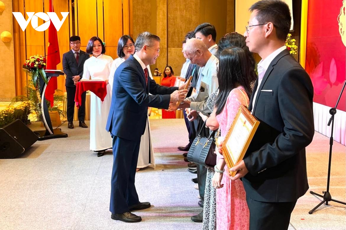 Đại sứ Lý Quốc Tuấn trao tặng giấy khen cho các cá nhân, tập thể có thành tích xuất sắc trong phòng, chống dịch Covid-19 và đóng góp tích cực vào công tác cộng đồng giai đoạn 2020-2022. |
