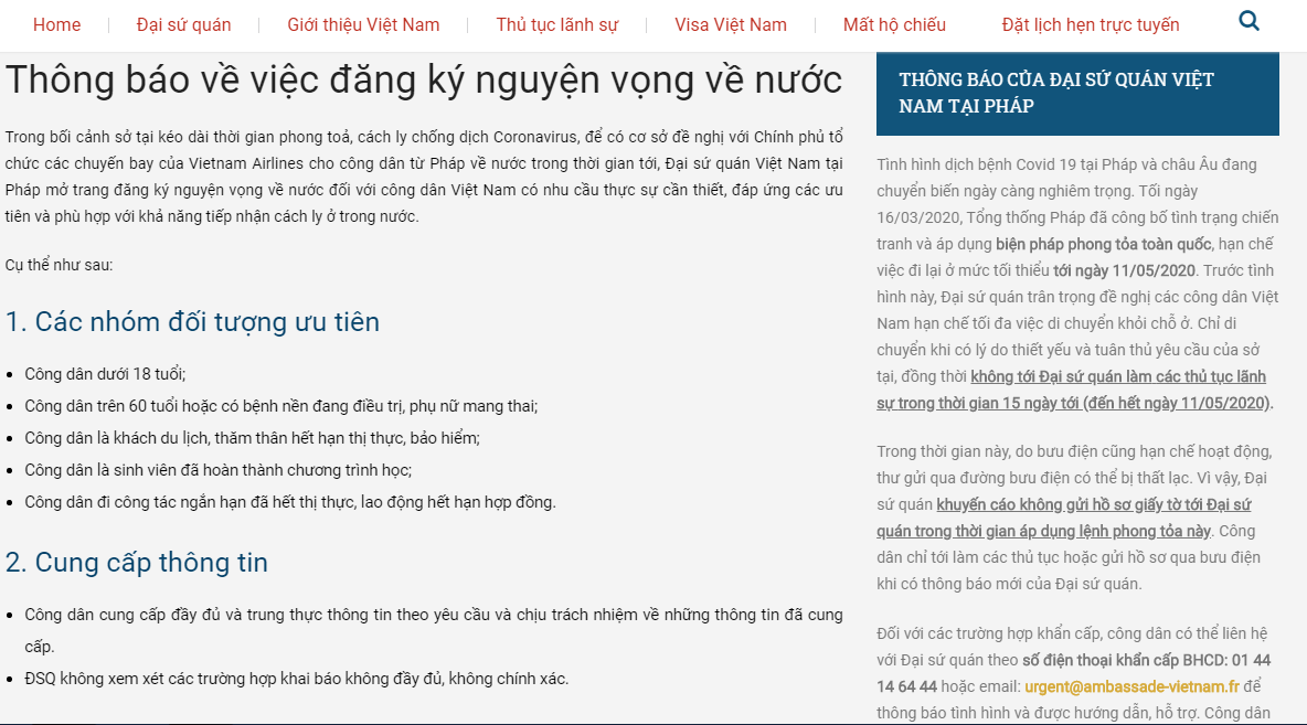 Thông báo về việc đăng ký nguyện vọng về nước cho công dân Việt Nam được đăng tải trên trang web chính thức của Đại sứ quán Việt Nam tại Pháp ngày 20/4. - Ảnh nguồn: Đại sứ quán Việt Nam tại Pháp |