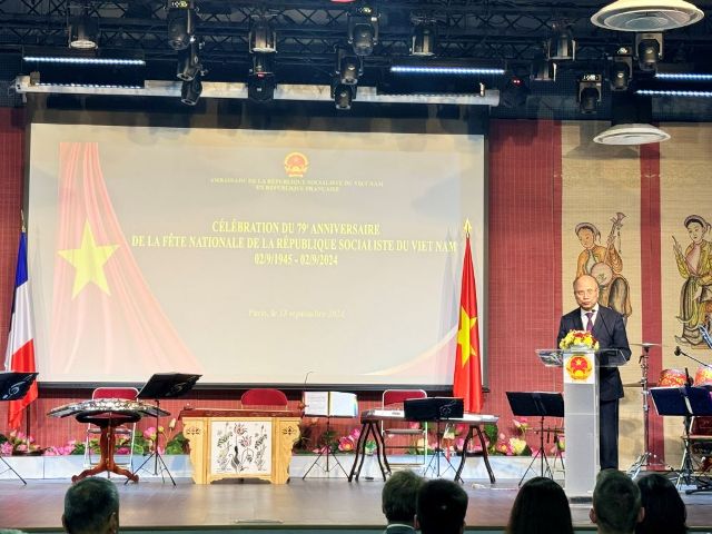 Ngày 13/9, tại thủ đô Paris, Đại sứ quán Việt Nam tại Pháp tổ chức kỷ niệm 79 năm Quốc khánh nước Cộng hòa xã hội chủ nghĩa Việt Nam (2/9/1945-2/9/2024) với sự hiện diện của đông đảo khách mời là đại diện của các cơ quan, ban ngành Pháp, các đoàn ngoại giao, các tổ chức quốc tế và bà con kiều bào.