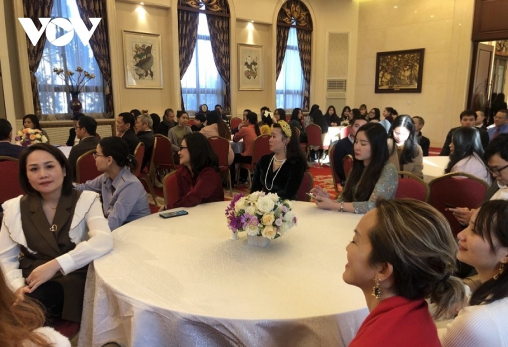 Tại buổi lễ, các cán bộ, nhân viên Đại sứ quán Việt Nam tại Trung Quốc và bà con cùng dành cho nhau những lời chúc tốt đẹp, thưởng thức các món ăn truyền thống dân tộc mừng Xuân mới.
