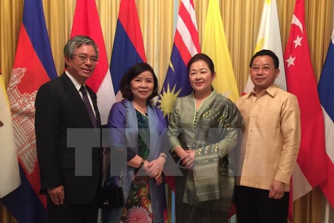 | Đại sứ Phạm Quang Vinh và Phu nhân chụp ảnh chung với Đại sứ Mai Sayvongs và Phu nhân. (Ảnh: Đoàn Hùng/TTXVN) |