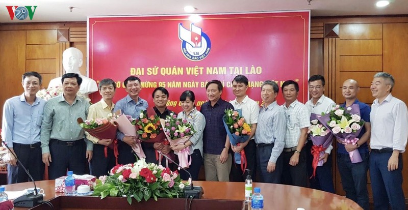 Đại sứ Nguyễn Bá Hùng và các cơ quan bên cạnh Đại sứ quán tặng hoa chúc mừng đội ngũ làm báo Việt Nam tại Lào. - Ảnh: VOV. |