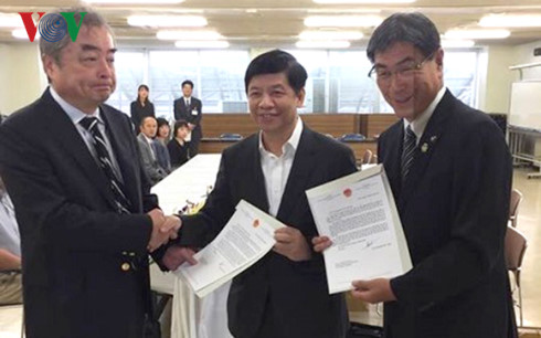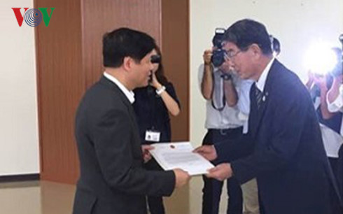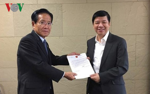 Đại sứ Việt Nam tại Nhật Bản Nguyễn Quốc Cường (trái) trao thư cảm ơn Thị trưởng Komagane. |