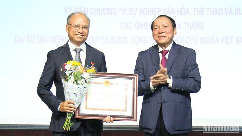 Bộ trưởng Bộ Văn hóa, Thể thao và Du lịch Nguyễn Văn Hùng trao Kỷ niệm chương “Vì sự nghiệp văn hóa, thể thao và du lịch” tặng Đại sứ Việt Nam tại Pháp. Ảnh: nhandan. |
