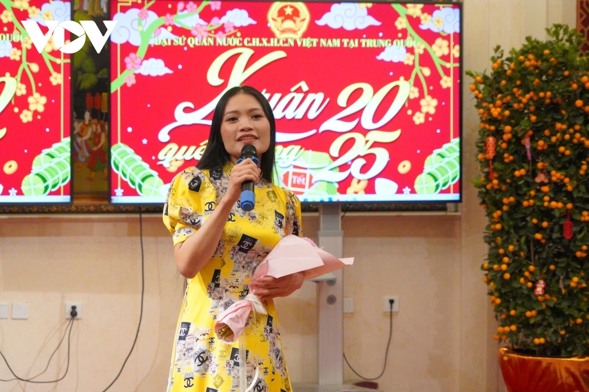 Chị Vũ Hoàng Thanh Loan, người đã định cư nhiều năm tại Bắc Kinh, xúc động chia sẻ: “Đây là cái Tết thứ 16 em xa nhà và cũng là cái Tết thứ 10 em đến Đại sứ quán ăn Tết. Cảm xúc của em lần nào cũng như lần đầu, bởi năm nào em cũng ăn Tết xa nhà. Em rất trông đợi chương trình Xuân Quê hương do Đại sứ quán tổ chức, để em được cảm nhận trọn vẹn hương vị Tết Việt Nam”.
