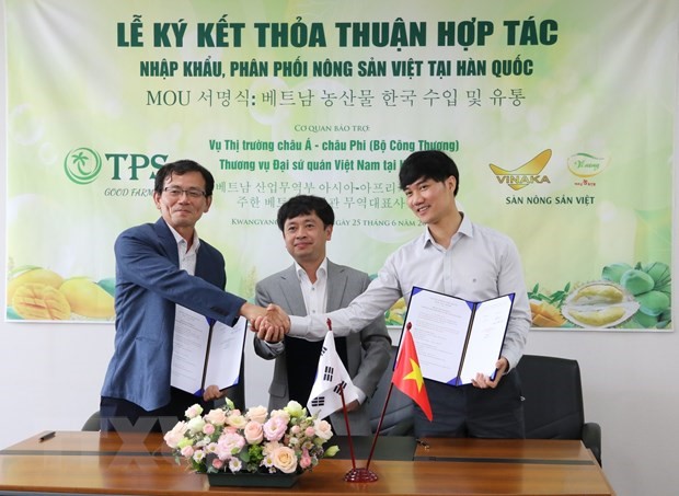 Sáng 25/6, tại thành phố Kwangyang, miền Nam Hàn Quốc, với sự hỗ trợ của Bộ Công Thương (Vụ Thị trường châu Á – châu Phi), Đại sứ quán Việt Nam tại Hàn Quốc, các công ty TPS Farmers và Vinaka đã ký kết Biên bản thỏa thuận hợp tác đẩy mạnh nhập khẩu và phân phối hàng nông sản Việt tại Hàn Quốc.