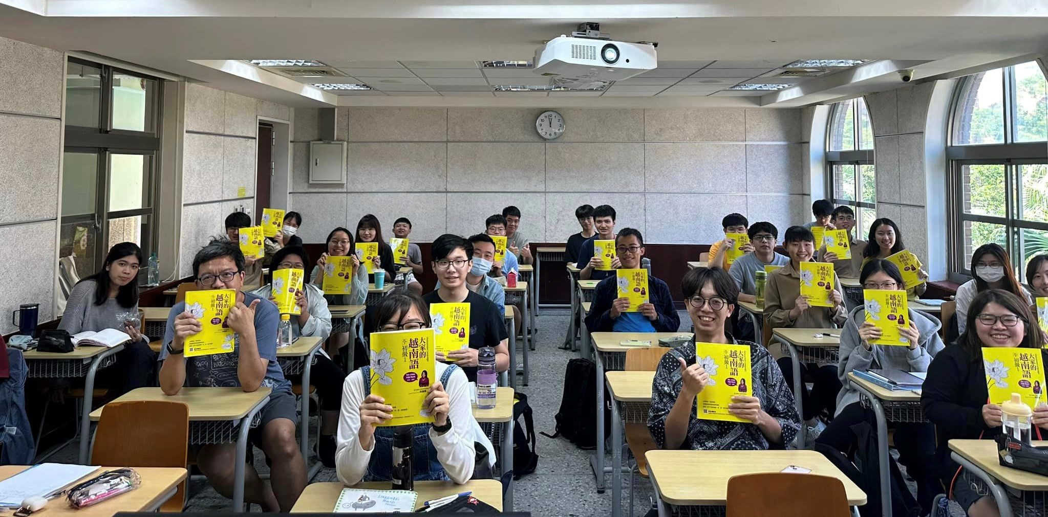 Các sinh viên Đại học Quốc gia Đài Loan với cuốn giáo trình học tiếng Việt của giảng viên Nguyễn Thị Liên Hương. |