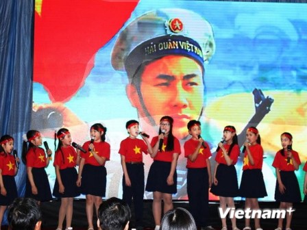 | Các em thiếu nhi đội Sơn ca trong "Đêm nhạc hướng về biển đảo quê hương và Chủ quyền Tổ quốc". (Ảnh: Ngọc Mai/Vietnam+) |