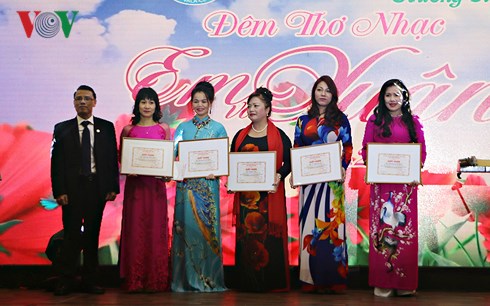 Tại đêm giao lưu, Trung ương hội người Việt Nam tại Cộng hòa Séc đã trao tặng Giấy khen cho một số chị em có đóng góp tích cực vào các hoạt động của cộng đồng trong thời gian vừa qua. Đêm giao lưu diễn ra trong không khí vui vẻ, ấm cúng, đoàn kết của những người con xa quê trong những ngày đầu xuân.