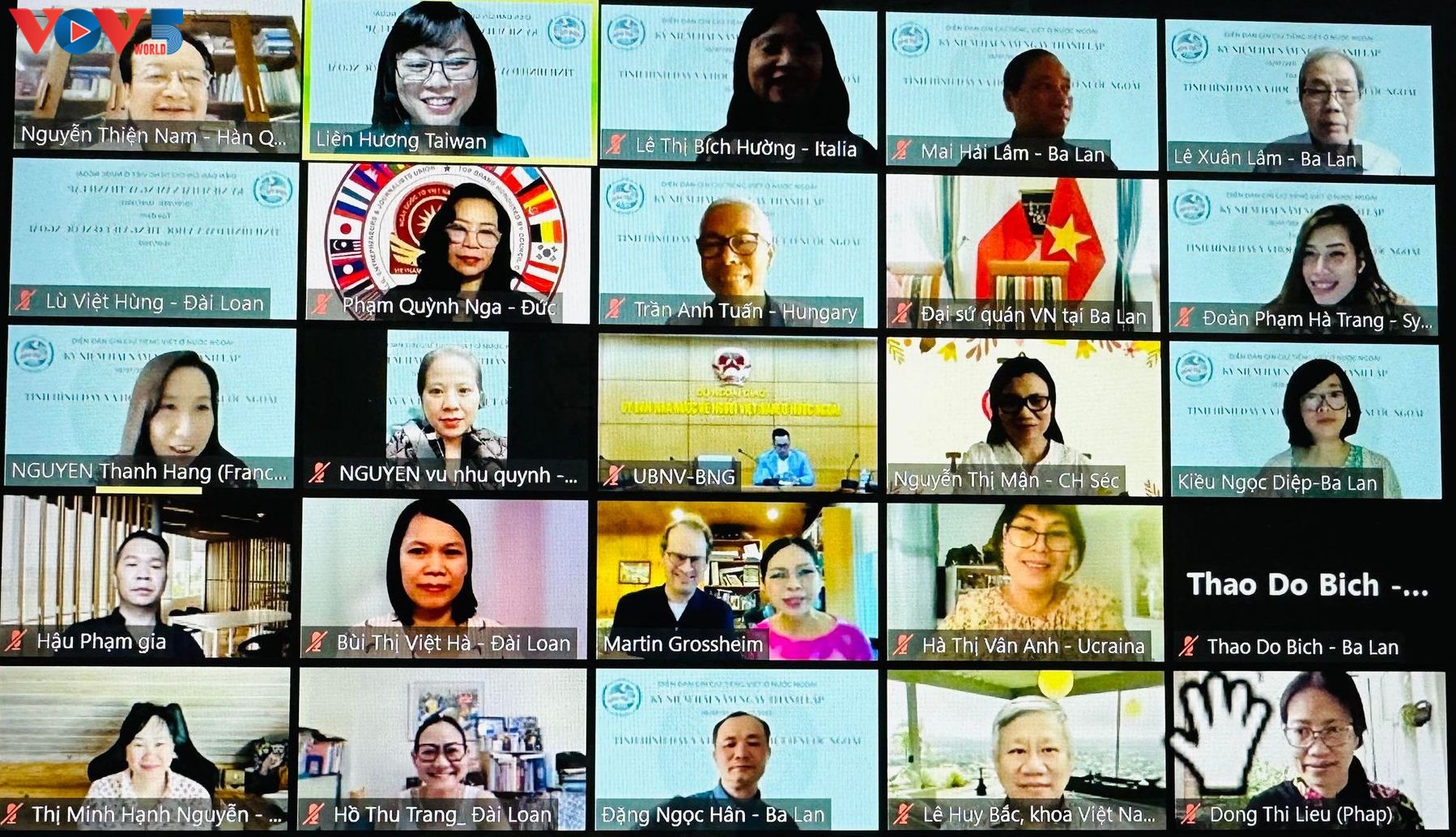 Đại biểu từ 16 nước tham dự tọa đàm "Tình hình dạy và học tiếng Việt ở nước ngoài” nhân kỉ niệm 2 năm thành lập Diễn đàn Gìn giữ tiếng Việt ở nước ngoài. - Ảnh chụp màn hình. |