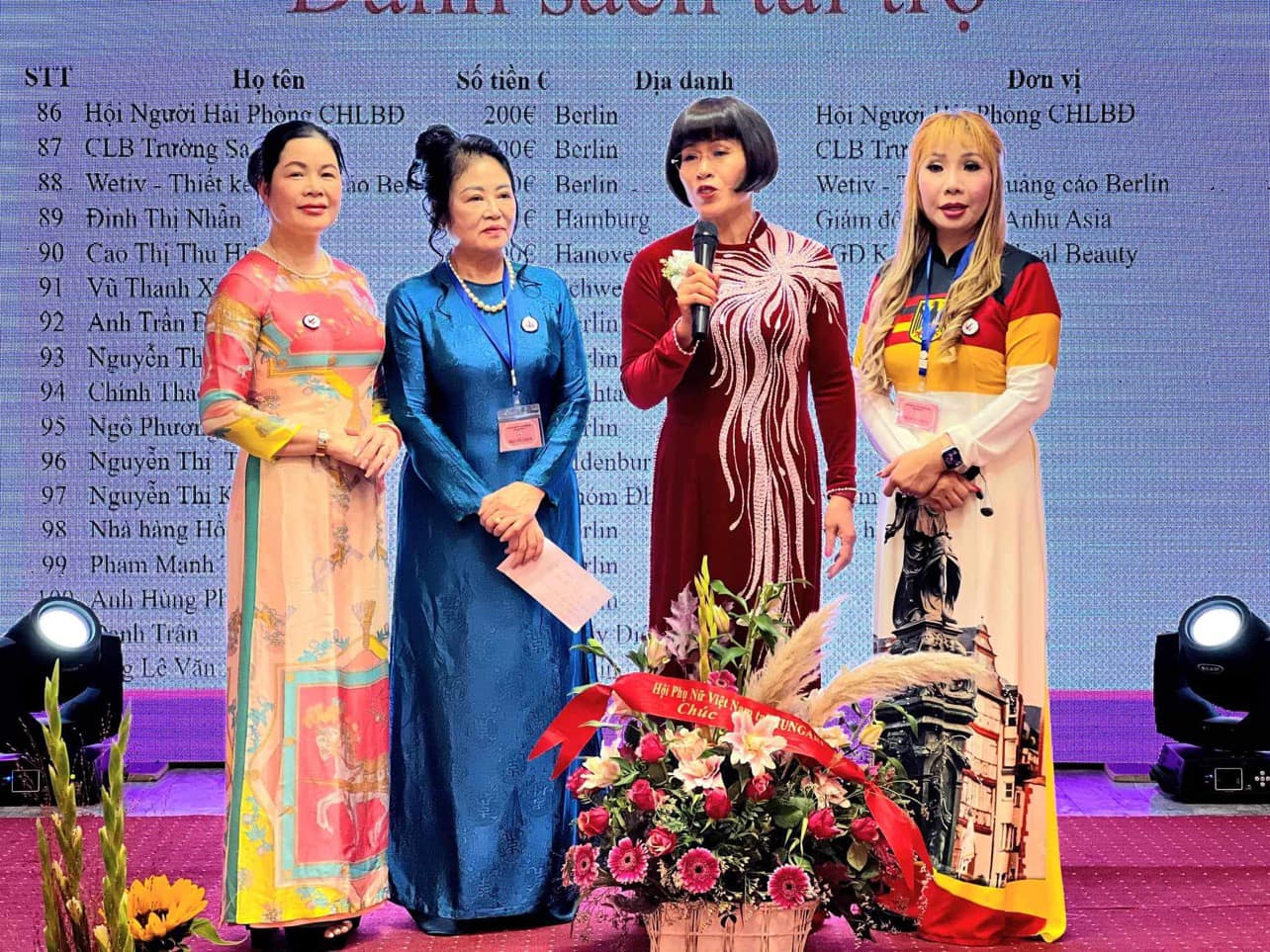 Bà Trịnh Thị Mùi (áo dài xanh) nhận lời chúc mừng từ Diễn đàn Phụ nữ Việt Nam tại Châu Âu và Hội Phụ nữ Việt Nam tại Hungary , trong Hội nghị thành lập Liên hiệp Hội phụ nữ Việt Nam CHLB Đức. - Ảnh: fp Diễn đàn |