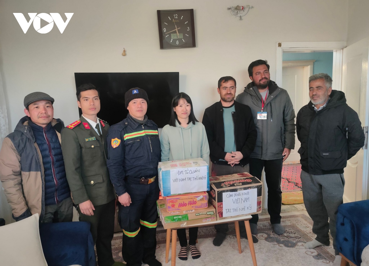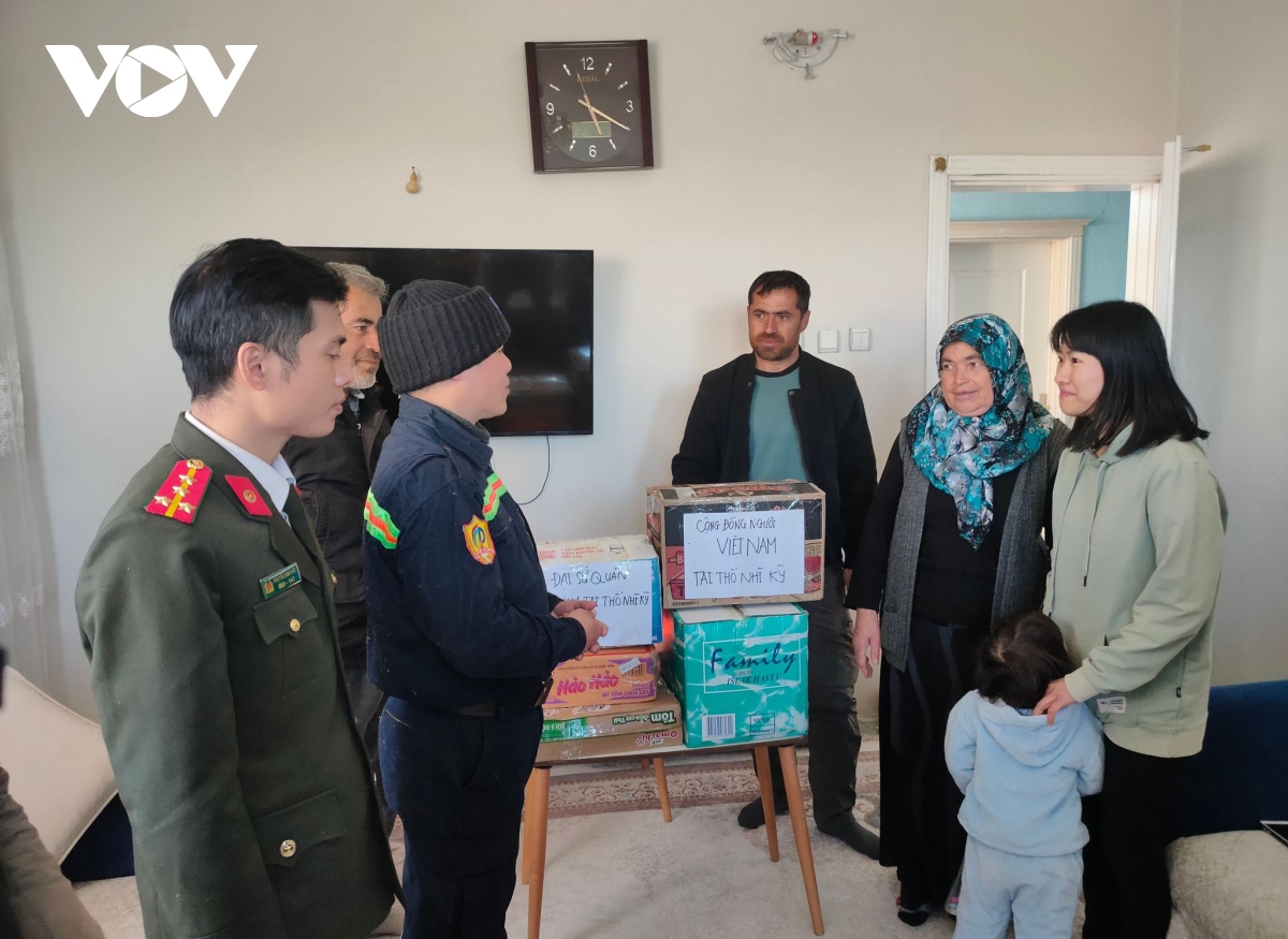 Với tinh thần tương thân tương ái, đoàn công tác đã gửi những lời động viên, chia sẻ đối với những mất mát, thiệt hại của bà con, đồng thời mong muốn bà con sớm ổn định tinh thần, yên tâm sinh sống, học tập và làm việc. Thay mặt đoàn công tác Việt Nam, Đại tá Nguyễn Minh Khương đã trao tặng các gia đình một số nhu yếu phẩm như quần áo, thực phẩm do đoàn công tác, Đại sứ quán Việt Nam cũng như bà con Cộng đồng người Việt ở Thổ Nhĩ Kỳ quyên góp để hỗ trợ các gia đình bị ảnh hưởng.