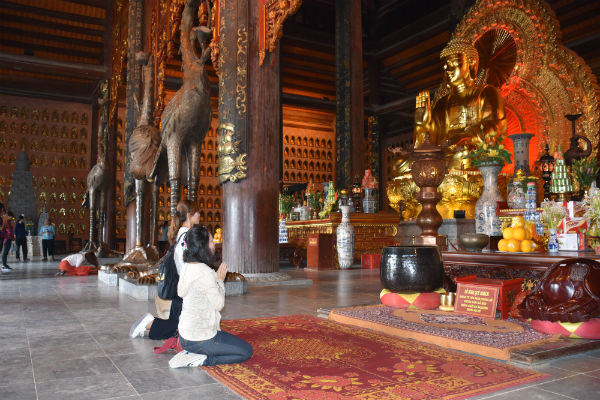 | Chùa Bái Đính nổi bật với kiến trúc vòm mái màu nâu sẫm cong vút hình đuôi chim phượng và chi tiết trang trí mang đậm dấu ấn của các làng nghề truyền thống ở VN. |