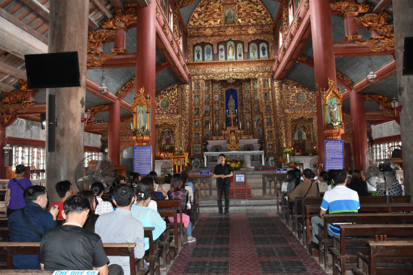 | Các thầy cô giáo tìm hiểu về lịch sử xây dựng và cấu trúc nhà thờ đá Phát Diệm. |