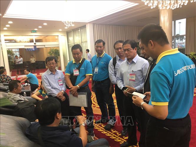 Đại diện các cơ quan chức năng, lãnh đạo Công ty Lữ hành Saigontourist thăm hỏi các du khách bị thương sau khi về đến sân bay quốc tế Tân Sơn Nhất - Ảnh: TTXVN |