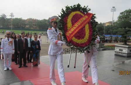 | Vòng hoa của đoàn mang dòng chữ "Đời đời nhớ ơn Chủ tịch Hồ Chí Minh vĩ đại" |