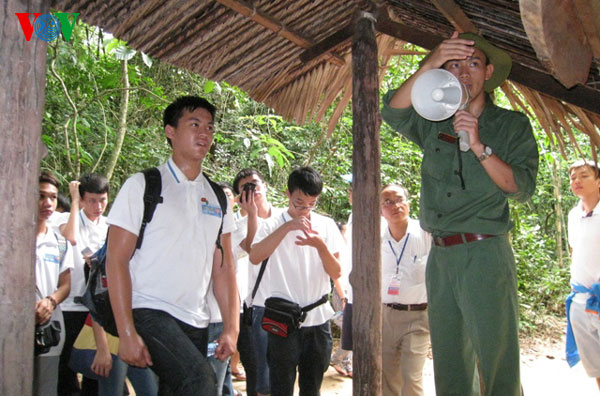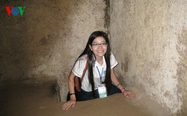 Chiều cùng ngày, đoàn thanh niên kiều bào tham quan khu di tích lịch sử địa đạo Củ Chi. Bạn Dương Thanh Nga, thanh niên người Việt tại Pháp chia sẻ: “Em chỉ biết là ngày xưa trong chiến tranh, nhân dân mình xây dựng địa đạo Củ Chi để làm căn cứ. Nó rất nhiều tầng. Đấy là địa đạo nổi tiếng trong chiến tranh”.