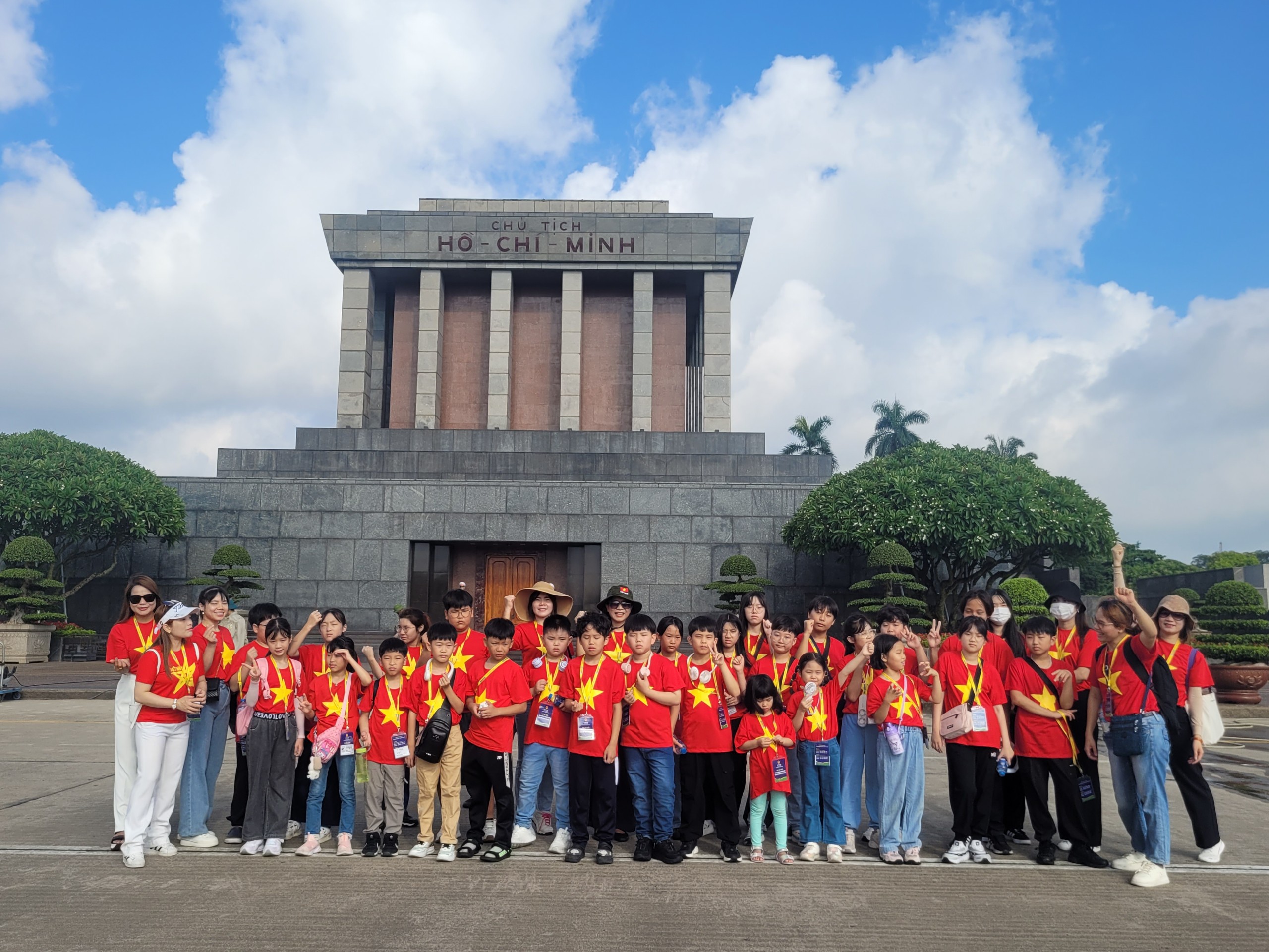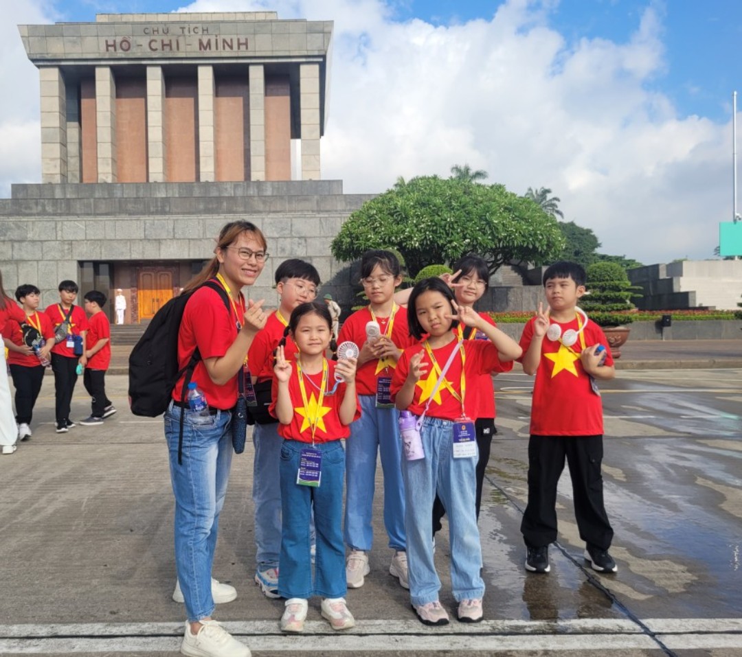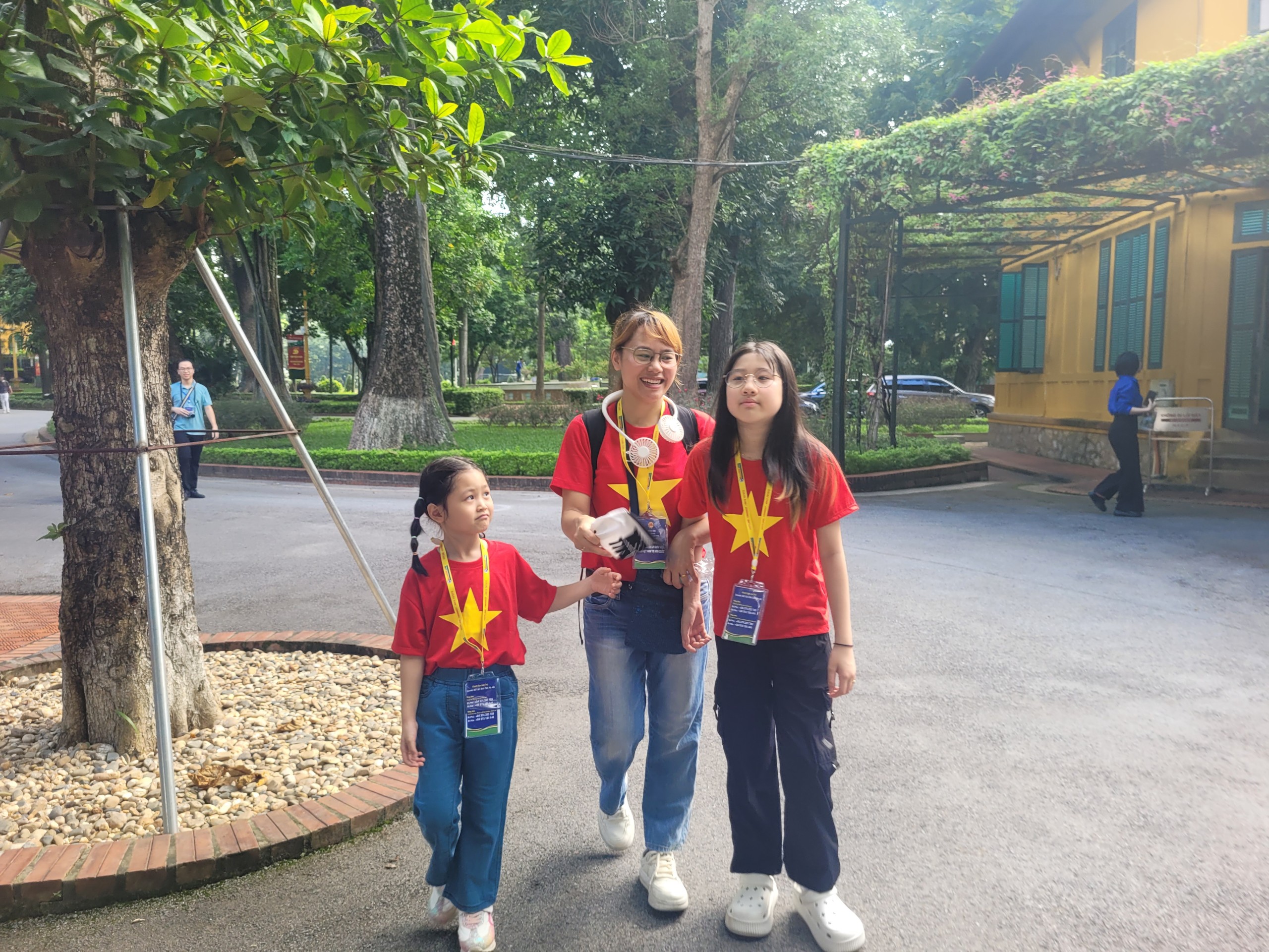 Trong sắc đồng phục áo cờ đỏ sao vàng rực rõ, hơn 30 thiếu nhi ở độ tuổi từ 10 đến 15 cùng các cô giáo đã đến thăm Quảng trường Ba Đình và tham quan khuôn viên Lăng Chủ tịch Hồ Chí Minh như Phủ Chủ tịch, Nhà sàn, vườn cây, ao cá.