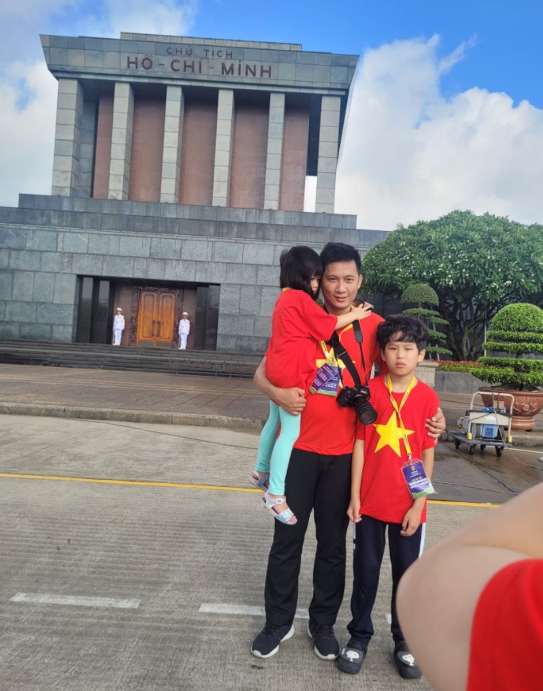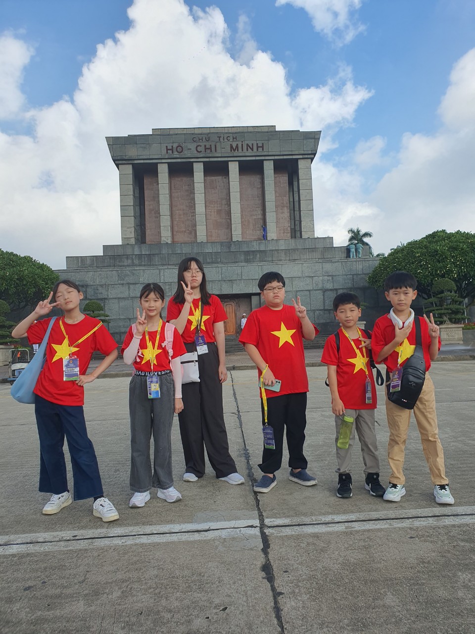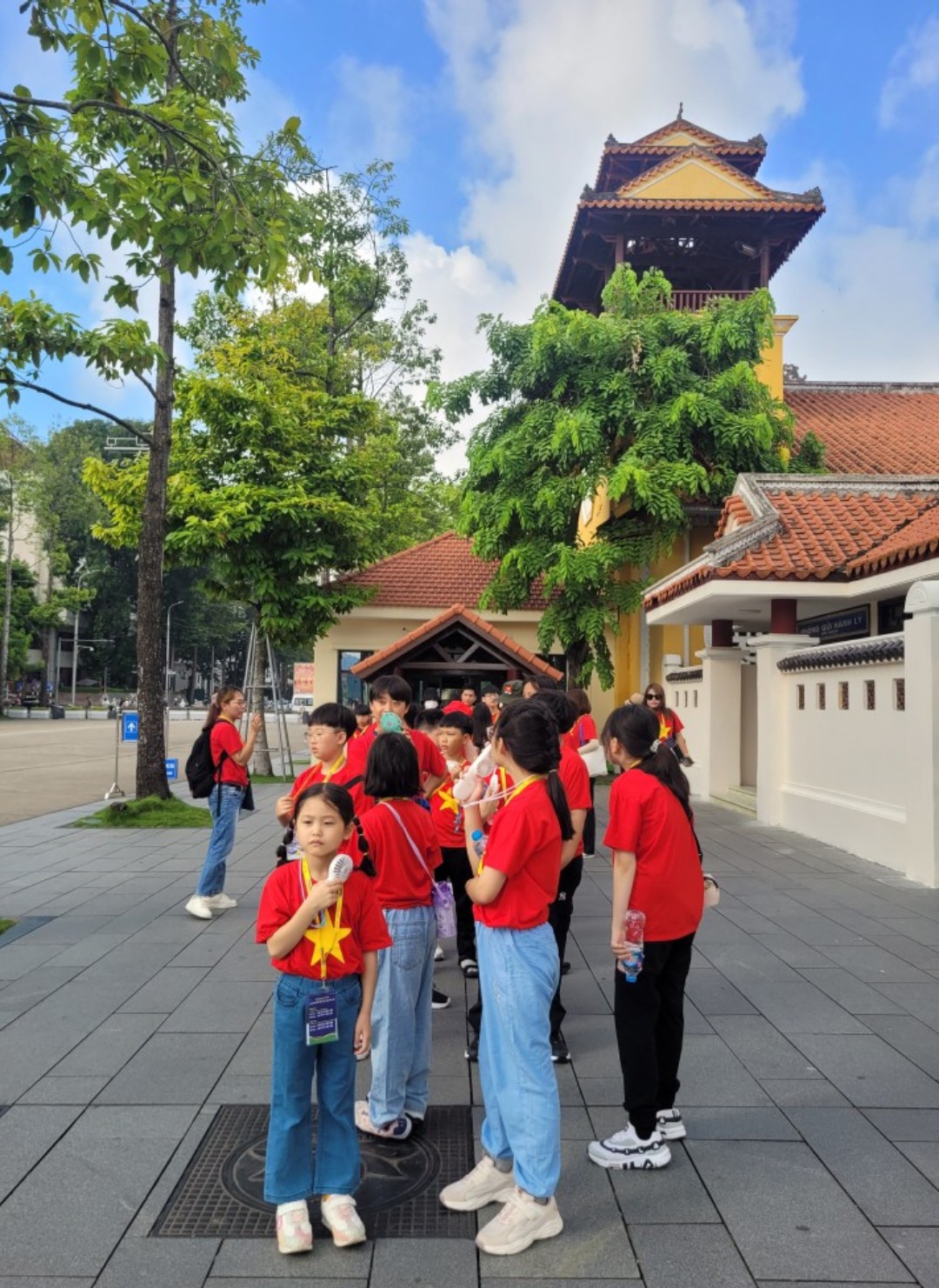Trong sắc đồng phục áo cờ đỏ sao vàng rực rõ, hơn 30 thiếu nhi ở độ tuổi từ 10 đến 15 cùng các cô giáo đã đến thăm Quảng trường Ba Đình và tham quan khuôn viên Lăng Chủ tịch Hồ Chí Minh như Phủ Chủ tịch, Nhà sàn, vườn cây, ao cá.