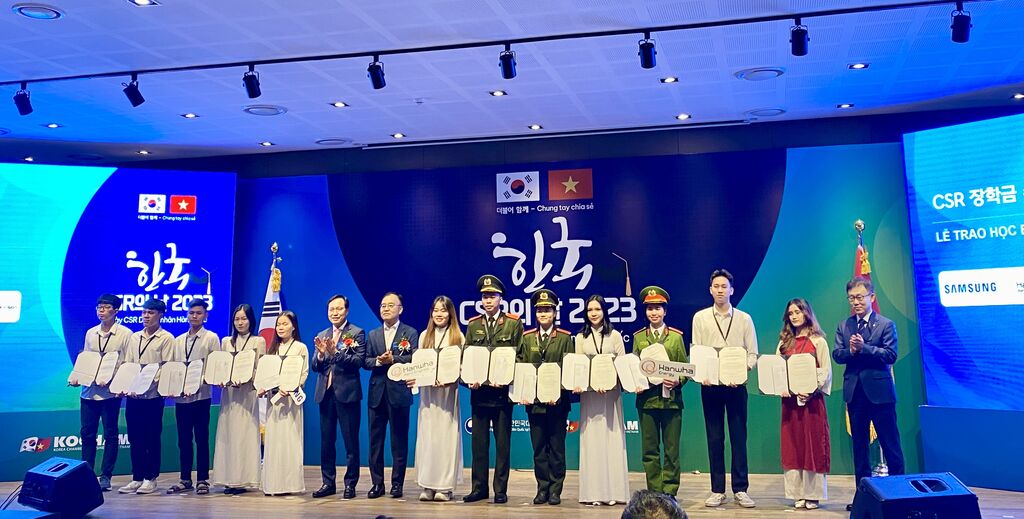 Hôm qua (29/11), tại Hà Nội, Đại sứ quán Hàn Quốc tại Việt Nam cùng Hiệp hội doanh nghiệp Hàn Quốc tại Việt Nam (KORCHAM) đồng tổ chức sự kiện “Ngày hội trách nhiệm xã hội Doanh nhân Hàn Quốc (CSR)” và Lễ trao học bổng “Chung tay chia sẻ” năm 2023. Tại Lễ trao học bổng, 61 doanh nghiệp Hàn Quốc tài trợ học bổng đã trao học bổng cho 115 em sinh viên với tổng giá trị hơn 40.000 USD (1,15 tỷ đồng).