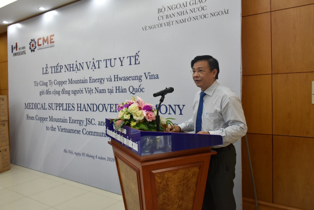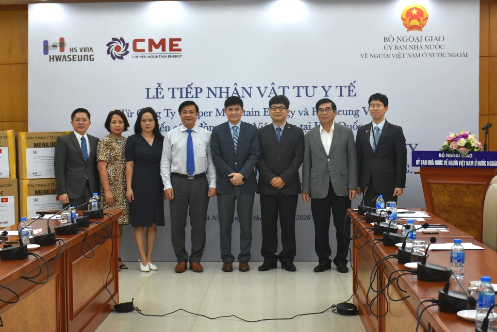 Sáng 02/6, Ủy ban Nhà nước về người Việt Nam ở nước ngoài tổ chức tiếp nhận 25.000 khẩu trang y tế cao cấp hỗ trợ kiều bào ở nước ngoài phòng chống dịch Covid - 19 do Công ty Năng lượng Copper Mountain Energy (CME) và Công ty Hwaseung Vina LLC (HSV), Hàn Quốc, trao tặng cho cộng đồng người Việt tại Hàn Quốc.
