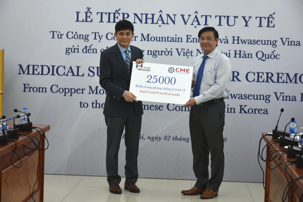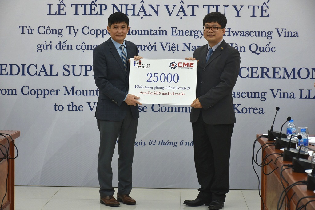 Tại buổi lễ, ông Bùi Trung Kiên, Tổng Giám đốc Công ty Năng lượng Copper Mountain Energy, cho biết: “Là doanh nghiệp hoạt động trong lĩnh vực năng lượng tái tạo, hướng đến sự phát triển bền vững, Công ty Copper Mountain Energy cùng với đối tác Hwaseung Vina LLC đã chung tay đóng góp nguồn vật tư y tế thiết thực là các khẩu trang bảo hộ phòng dịch gửi tới bà con kiều bào ta tại Hàn Quốc với mong nguyện mọi người đều được bình an, vượt qua những ngày tháng khó khăn này”.