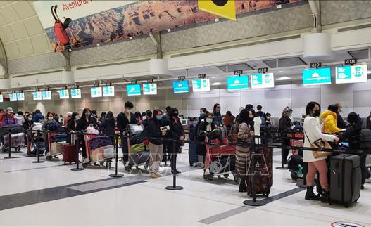 Công dân Việt Nam đang xếp hàng để làm thủ tục tại sân bay quốc tế Toronto, Canada để về nước. - Ảnh: Vũ Quang Thịnh/TTXVN |