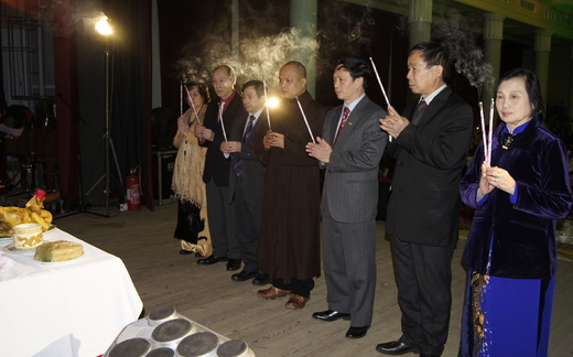 Sau màn múa lân sôi động của võ đường Thiếu Lâm Hồng gia quyền, theo truyền thống văn hóa dân tộc Đại sứ Phạm Kiến Thiết, Đại đức Thích Đức Đạt và 5 vị lãnh đạo của các tổ chức Cộng đồng đã thắp hương tiễn năm cũ Quí Tỵ, đón năm mới Giáp Ngọ.