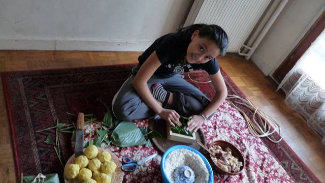 Cô em Viki Ly Anh đã ngồi cả buổi sáng để rửa lá, róc lá giúp mẹ. Vừa hướng dẫn các con gói bánh chị Thiện vừa kể cho các cháu nghe về sự tích bánh chưng. „ Bên cạnh niềm vui với thành quả những chiếc bánh chưng xinh xắn do các cháu tự gói, các cháu còn biết thêm nhiều về các phong tục ngày Tết cũng như lịch sử quê hương Việt Nam”- chị Thiện chia sẻ.