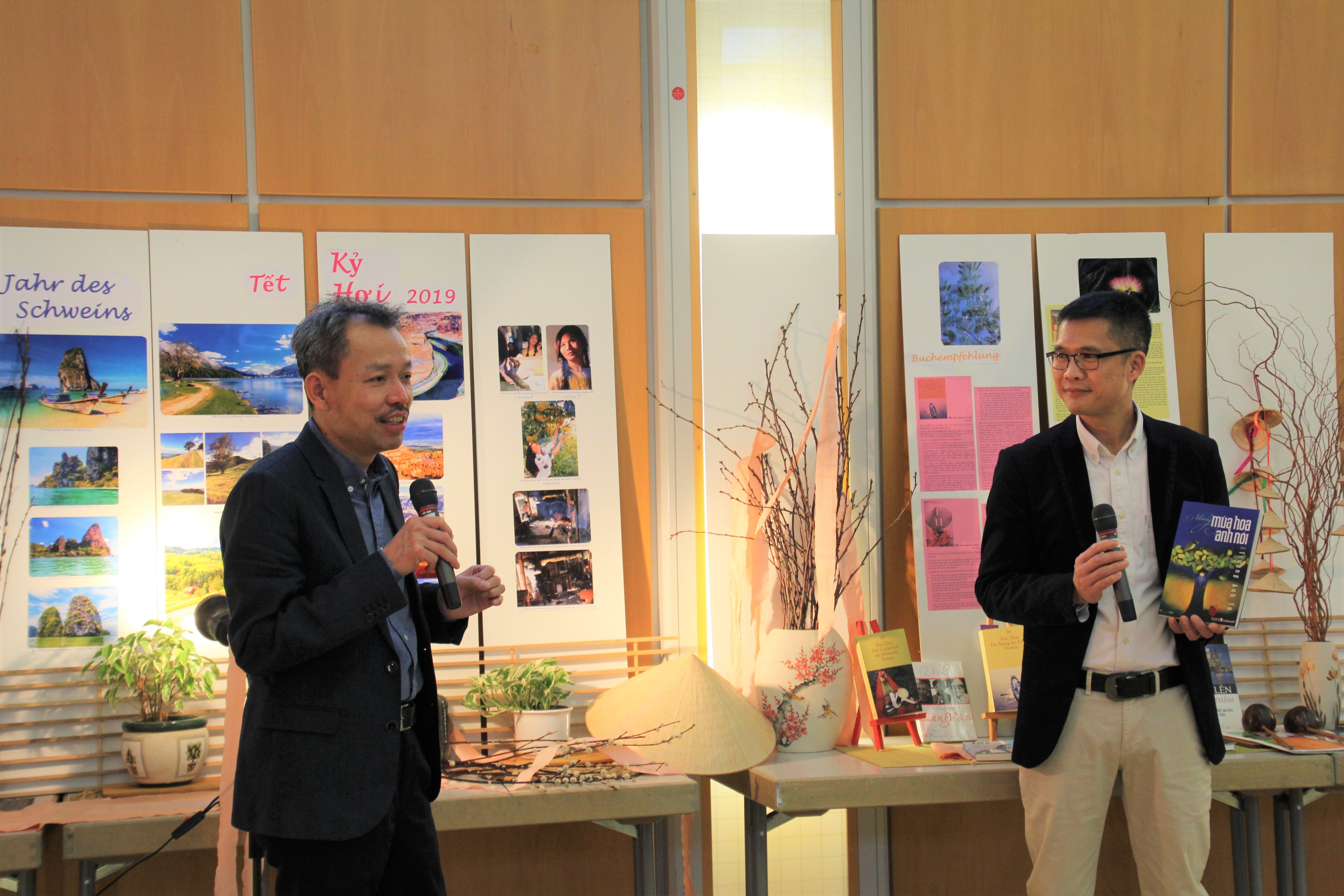 Tác giả Trương Anh Tú (trái) giới thiệu về tập thơ „Những mùa hoa anh nói“ (NXB Hội nhà văn 2018) trong phần giao lưu - sinh hoạt văn hóa tại buổi lễ.