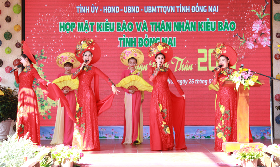 | Đoàn ca múa nhạc Đồng Nai biểu diễn các ca khúc về mùa xuân phục vụ bà con kiều bào dự họp mặt.- Ảnh: Báo Đồng Nai |