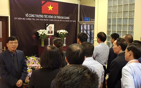 Trong sổ tang, Đại sứ Phạm Vinh Quang và Đại sứ Trần Đức Bình bày tỏ vô cùng thương tiếc Chủ tịch nước Trần Đại Quang, người lãnh đạo mẫu mực, tâm huyết, có nhiều đóng góp lớn cho sự nghiệp xây dựng và bảo vệ Tổ quốc Việt Nam.