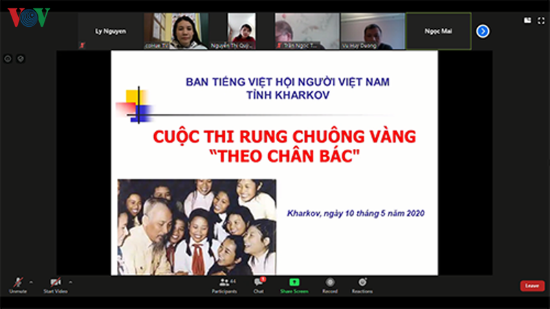 Cũng trong chuỗi các hoạt động hướng tới kỷ niệm 130 năm ngày sinh của Chủ tịch Hồ Chí Minh vĩ đại (19/5/1890-19/5/2020), chiều 10/5, Ban tiếng Việt-Hội người Việt Nam tỉnh Kharkov đã tổ chức cuộc thi Rung chuông vàng trực tuyến với chủ đề “Theo chân Bác” dành cho con em cộng đồng đang theo học các lớp tiếng Việt trong thành phố.