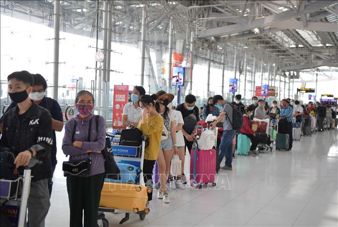 Công dân Việt Nam xếp hàng làm thủ tục chờ lên máy bay về nước. Ảnh: TTXVN |