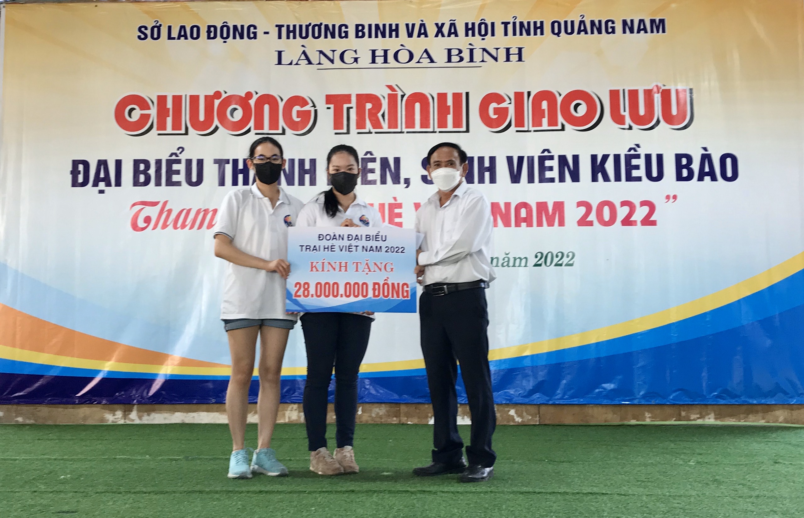 Ông Đặng Đôi, Giám đốc làng Hoà Bình, Quảng Nam, đại diện cho làng, tiếp nhận số tiền 28 triệu đồng là tấm lòng của các kiều bào trẻ gửi tặng. |