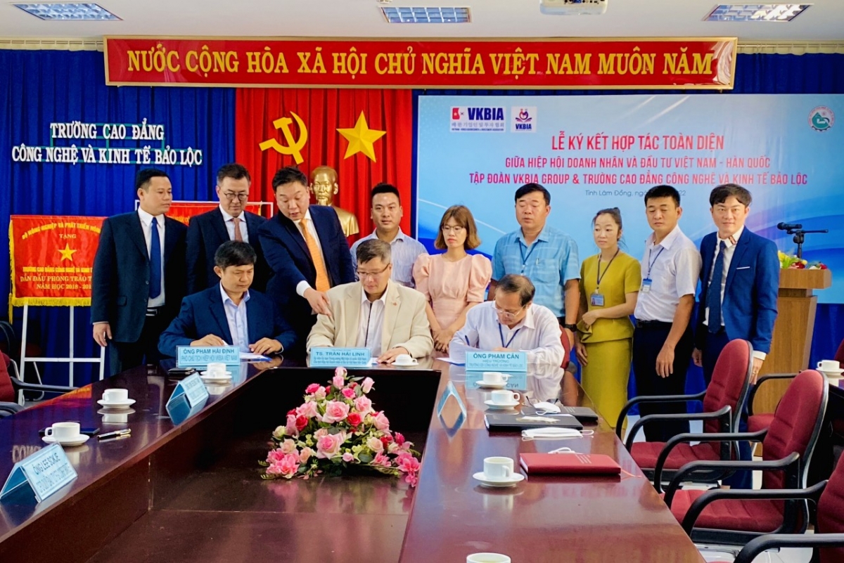Trước đó, Lễ ký kết Hợp tác toàn diện cho chương trình liên kết giáo dục và đào tạo, phát triển nguồn nhân lực trình độ cao, tay nghề cao giữa Hiệp hội Doanh nhân & Đầu tư Việt Nam-Hàn Quốc (VKBIA) và Cao đẳng Công nghệ & Kinh tế Bảo Lộc đã được thực hiện. Dự buổi lễ có TS. Trần Hải Linh - Ủy viên Ủy ban Trung ương Mặt trận Tổ quốc Việt Nam – Chủ tịch Hiệp hội Doanh nhân & Đầu tư Việt Nam -Hàn Quốc (VKBIA), ông Phạm Cân - Hiệu trưởng trường Cao đẳng Công nghệ & Kinh tế Bảo Lộc.