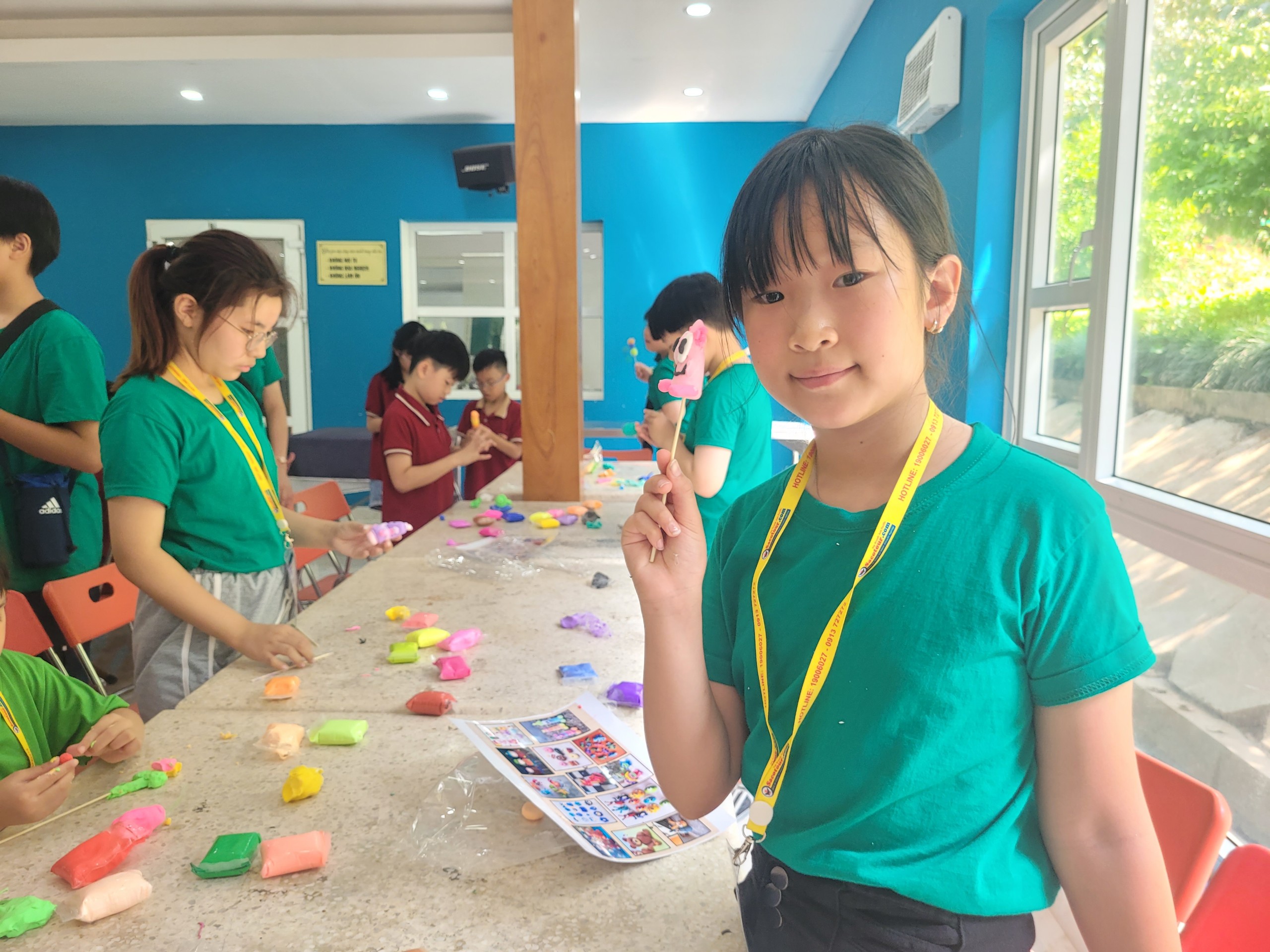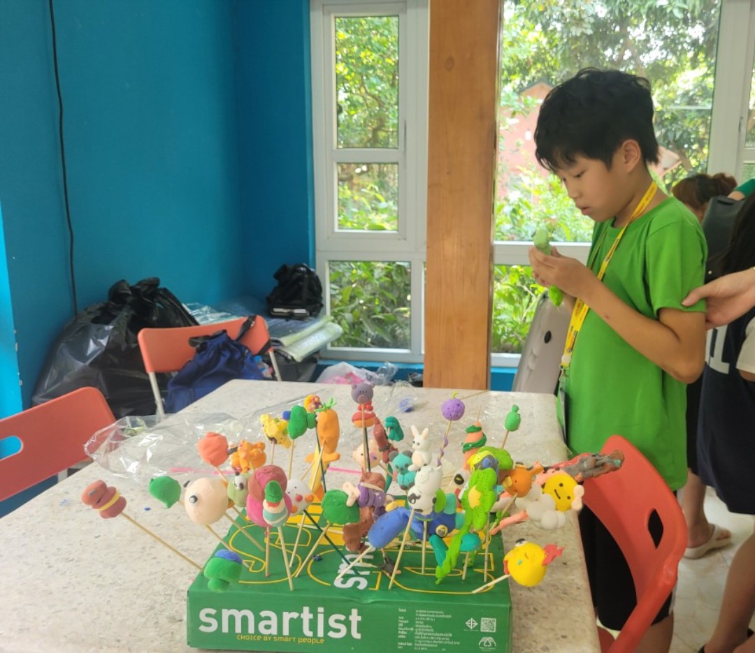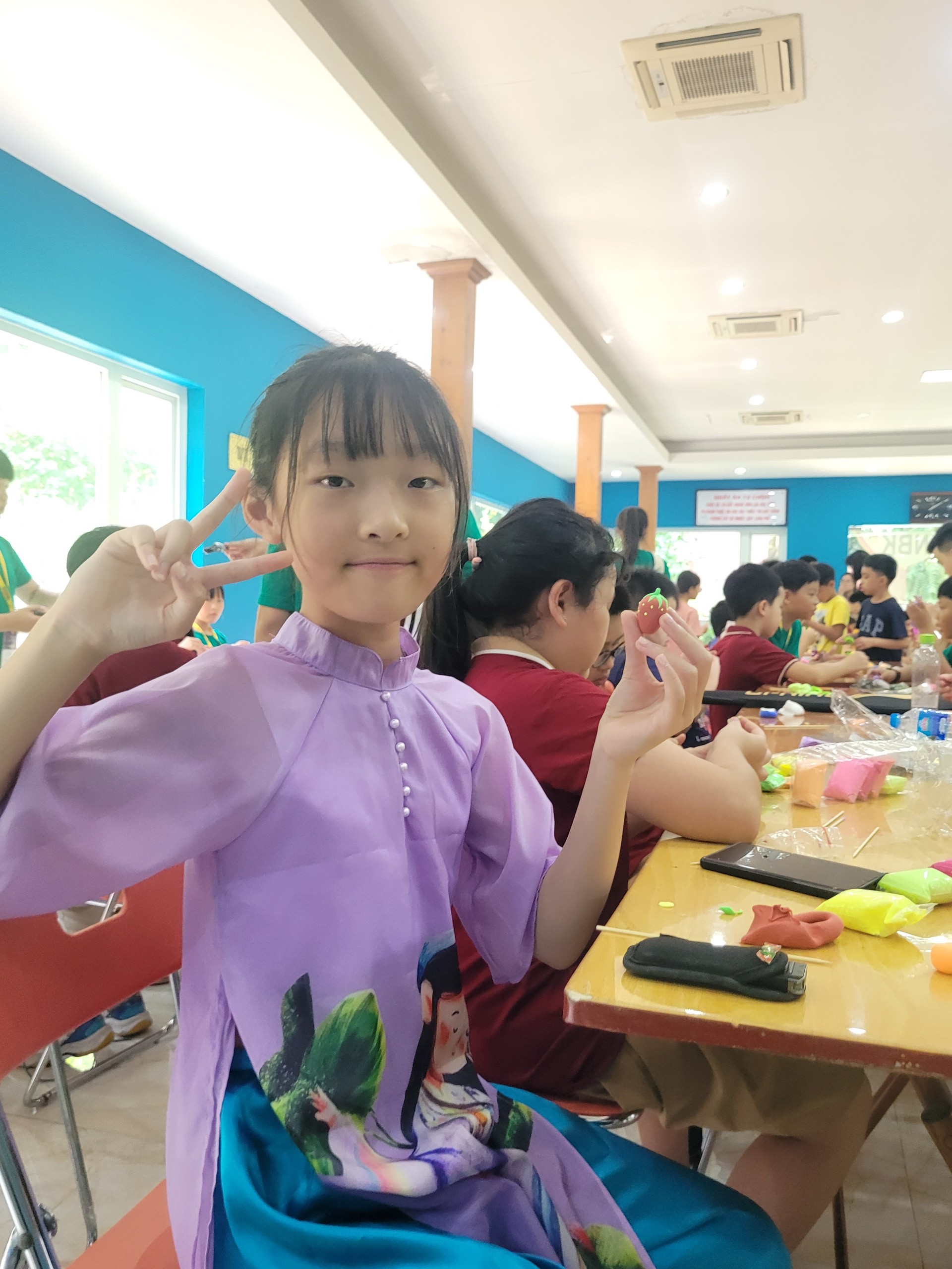 Hoạt động trải nghiệm mỹ thuật tạo hình nặn tò he có lẽ gây được sự thích thú nhất đối với các bạn nhỏ kiều bào Hàn Quốc. Em Kim Min Ánh thích thú khoe: “Nay con làm được quả dâu tây rất đẹp. Con thích hoạt động làm tò he nhất bởi con được chơi với sắc màu và nặn được thoải mái những hình con thích. Con vui vì được tham gia những tham gia trò chơi hôm nay. Lúc nấu cơm niêu,con ở nhóm số 7”.