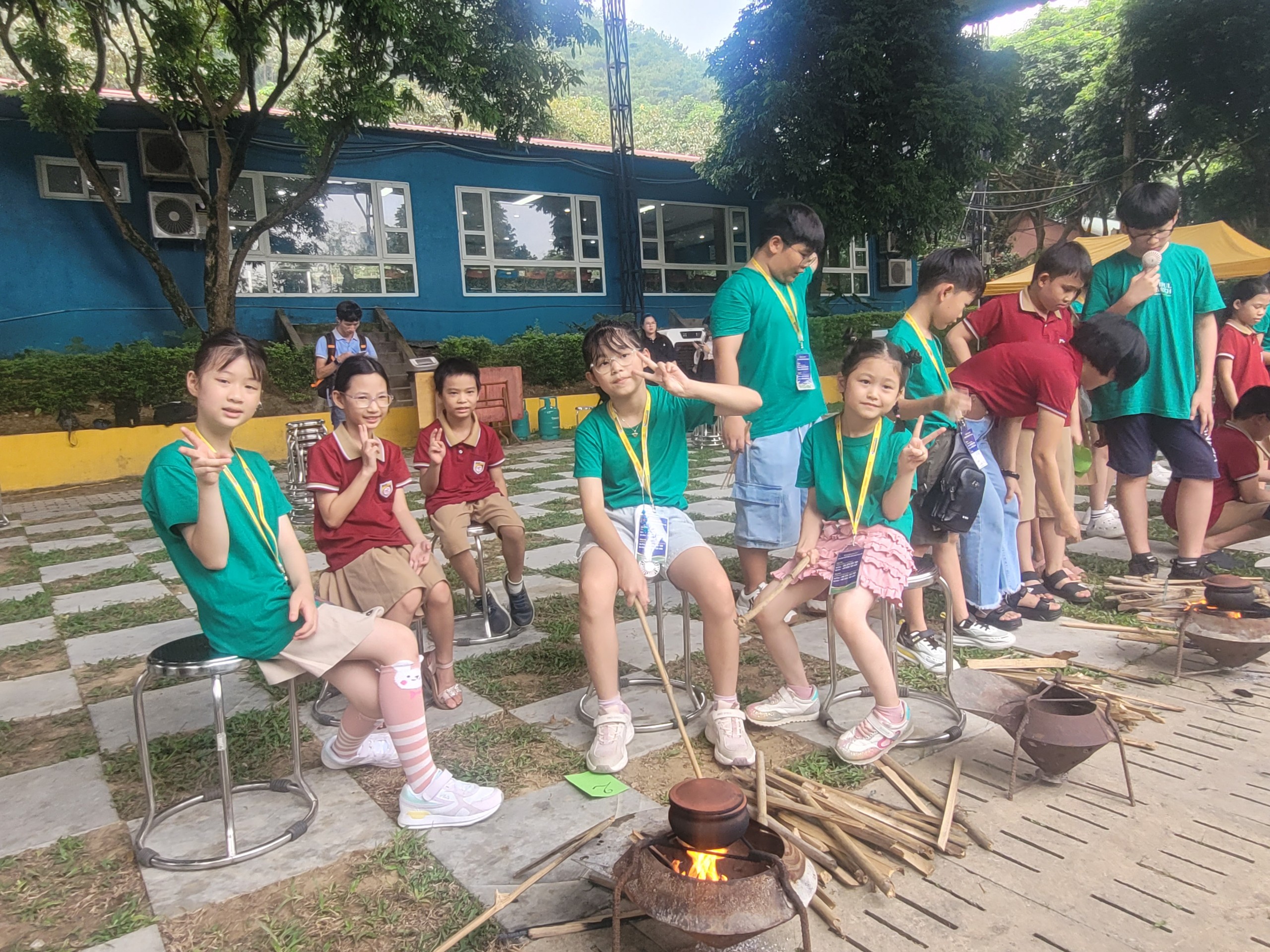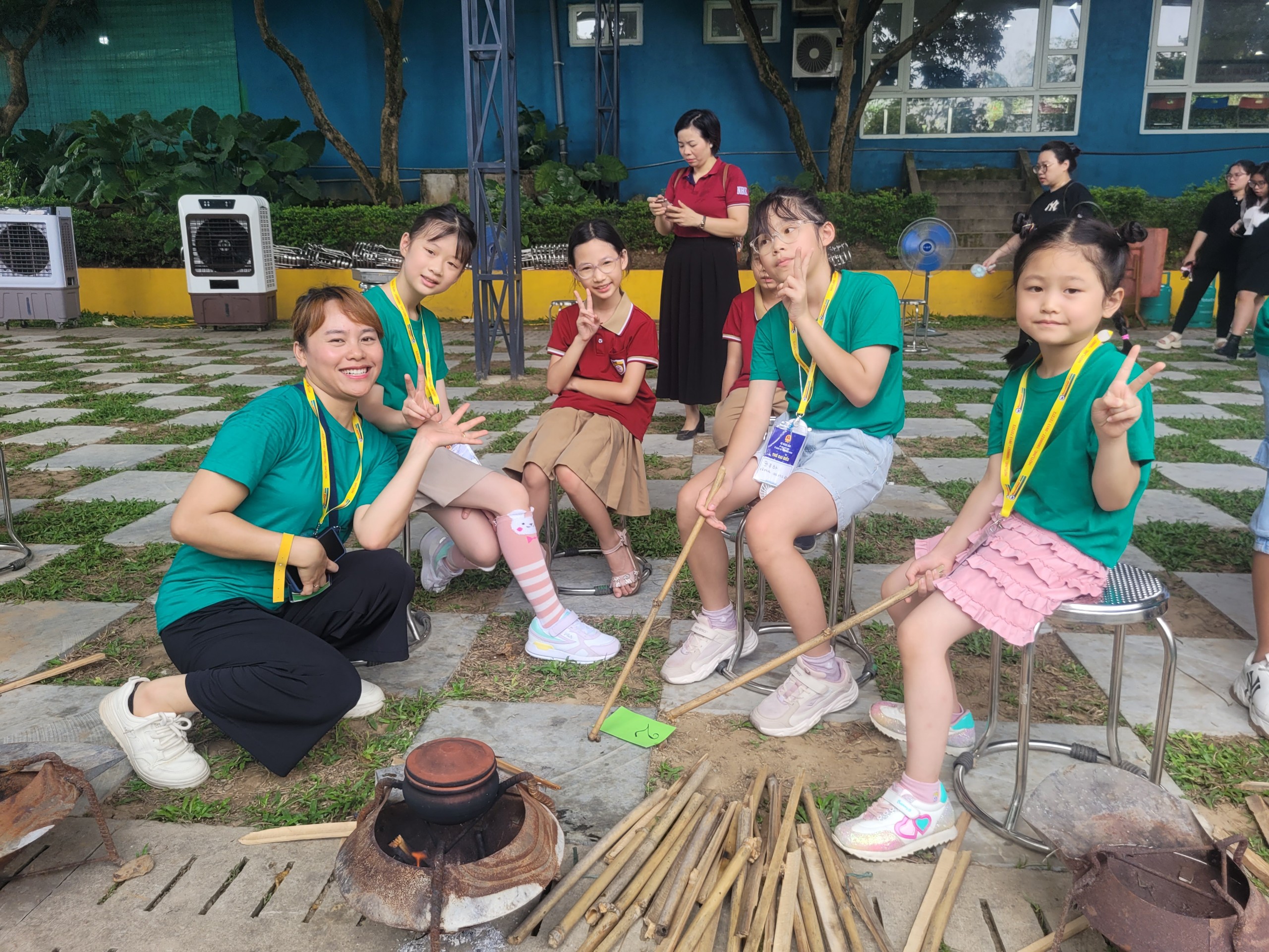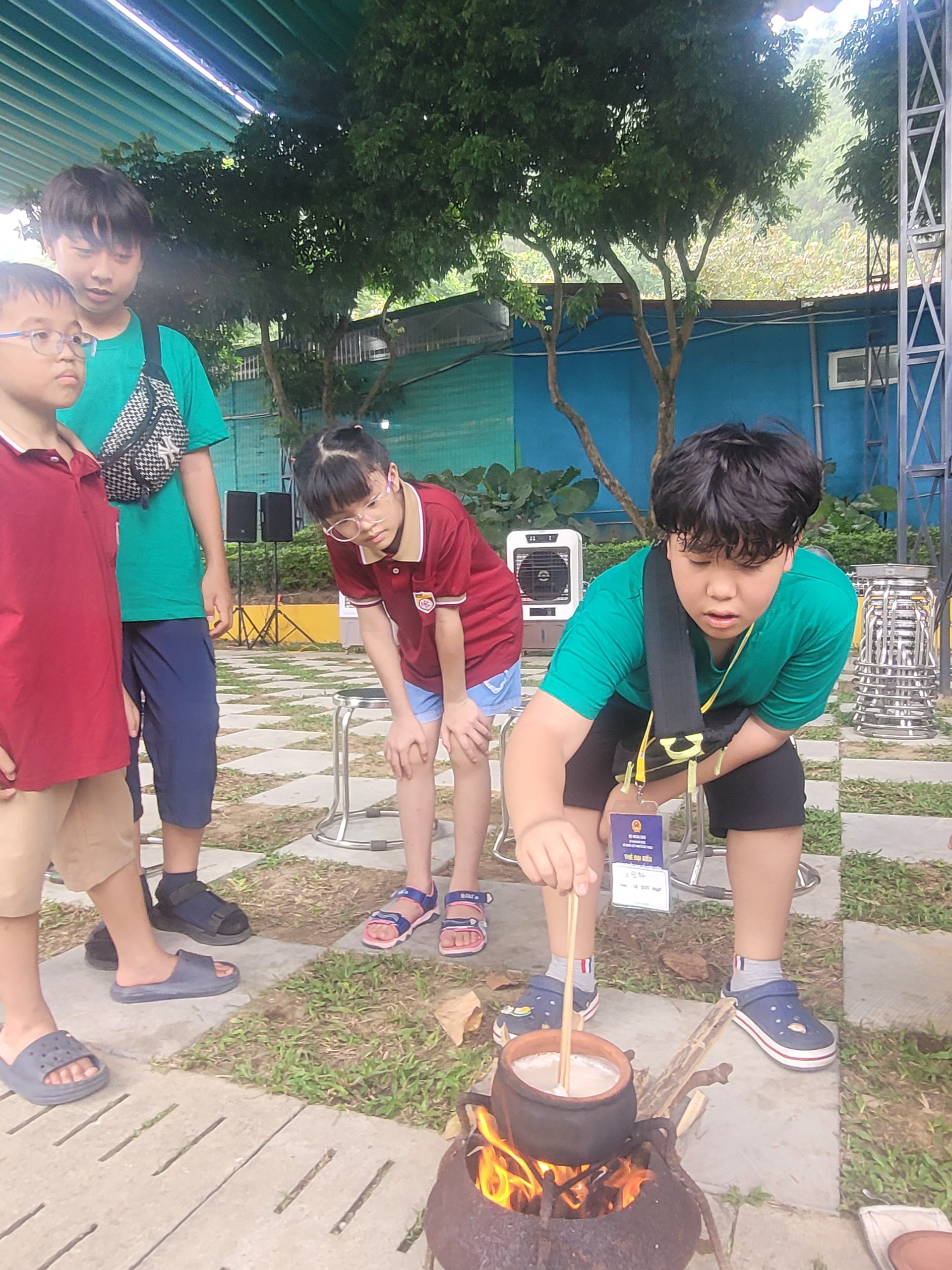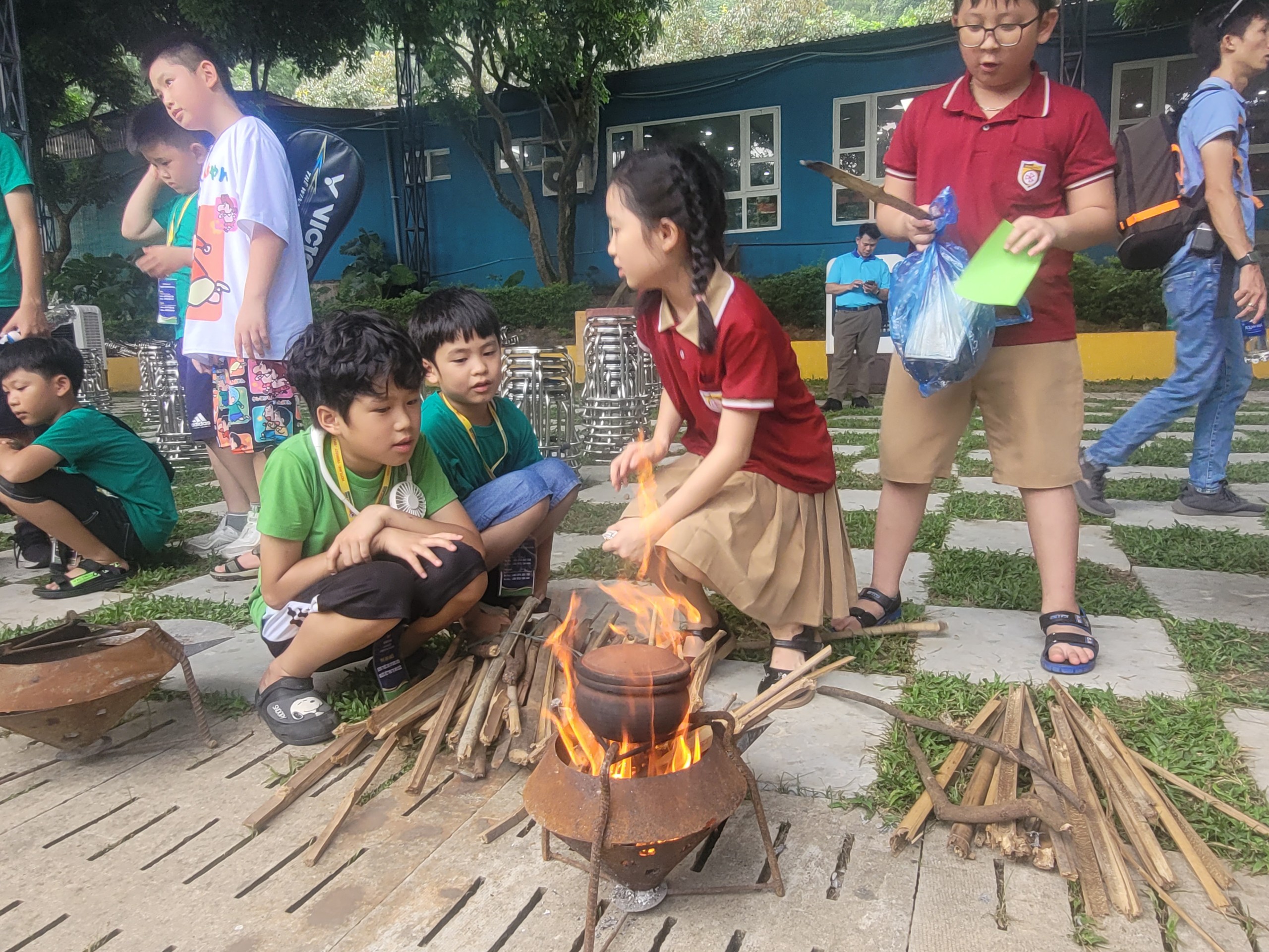 Nhóm nấu cơm niêu của em Đoàn Việt Khôi (bé trai áo xanh, tóc xoăn) |
