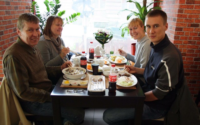 Không cầu kỳ trang trí như nhiều hàng quán tôi từng gặp. Một biển hiệu nhỏ khiêm tốn treo trên góc tường, các mặt kính cửa sổ sáng bóng nhìn thấu những chiếc bàn ăn kiểu cổ kê bên trong. Đã qua giờ trưa nhưng các bàn ăn của quán phở Family vẫn còn nhiều khách đang ngồi ăn, uống. Phở là món ăn được nhiều người lựa chọn nhất khi tới đây. Thứ nước được ninh ra từ xương trong cái nồi to đùng trên bếp kia rồi lọc ra, kết hợp với những nguyên liệu được lấy từ quê hương nguồn gốc phở Nam Định, là quê của anh chị, thử hỏi có đâu bằng? Có lẽ vậy nên những ông Tây bà đầm kia mới vừa ăn, vừa xuýt xoa nghiêng bát chắt đến giọt cuối cùng của bát phở? Đã qua nhiều nghề trên đất khách, cuối cùng sau bao bươn trải, thử nghiệm, anh chị dừng lại với nghề chế biến món ăn, đặc biệt những món ăn thuần Việt. Bây giờ, tìm địa chỉ để ăn một bát phở chế biến theo kiểu Việt Nam không còn quá khó với khách du lịch khi đến thăm thủ đô Praha. Theo xu hướng ngày càng tăng về nhu cầu thưởng thức ẩm thực châu Á, mà phở Việt đang ở thế thượng phong thì việc người Việt mở phở Việt là điều tất yếu. Song vì không nắm rõ công thức chế biến món ăn truyền thống này mà nhiều quán đã phải đóng cửa sau một thời gian ngắn.