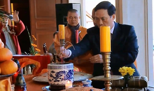 Đại sứ Phạm Kiến Thiết cùng các đại đức và bà con lần lượt thành kính dâng hương bái tổ.