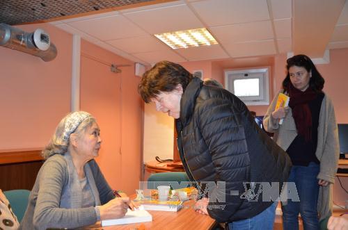 | Bà Trần Tố Nga ký tặng sách sau buổi nói chuyện về thảm họa da cam. Ảnh: Bích Hà/TTXVN |