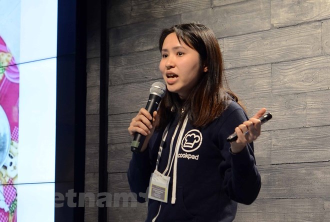 Yazu Trang - một người Việt trẻ thành công tại Cookpad - đang chia sẻ nghề nghiệp với các khách mời tham dự sự kiện. - Ảnh: Thành Hữu/Vietnam+ |