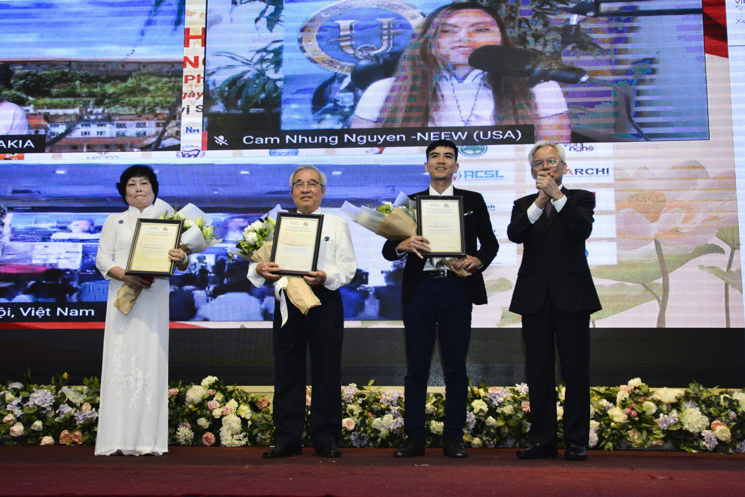 Trao giải King´s Prize tại Lễ Vinh danh Con cháu Vua Hùng toàn cầu cho một số tác giả đoạt giải và bạn bè quốc tế: bà Nguyễn Cẩm Nhung (USA); bà Đỗ Phương Ly (đầu cầu Slovakia) và ông Christopher Olusegun Fanu (Nigieria). Trong ảnh: Đại diện gia đình các tác giả đoạt giải lên đón nhận các phần quà từ Ban tổ chức |