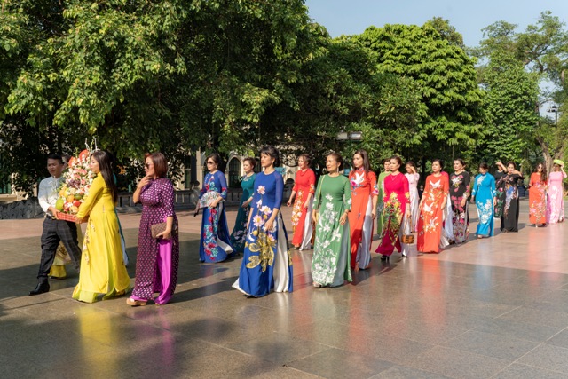 Trong khuôn khổ chương trình “Thủ đô Hà Nội trong lòng người xa xứ”, ngày 14/8, các phu nhân đại diện cho chị em phụ nữ người Việt tại Châu Âu đã có những màn trình diễn áo dài ấn tượng tại một số địa điểm nổi tiếng của Hà Nội.