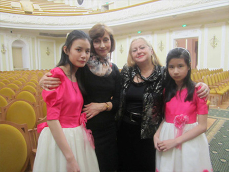 ![]() Trần Diệu Ân (ngoài cùng bên trái) và Trần Diệu Linh (ngoài cùng bên phải) cùng hai cô giáo dạy nhạc người Nga trong ngày biểu diễn 31/3 tại Mátxcơva. |