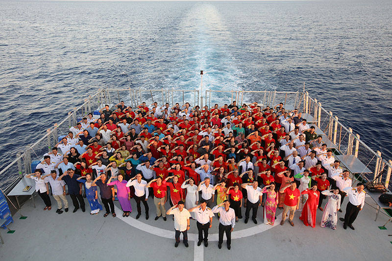 Bà con kiều bào từ nhiều quốc gia trên thế giới chụp ảnh kỷ niệm trong chuyến công tác thăm quân và dân huyện đảo Trường Sa và Nhà giàn DKI. |
