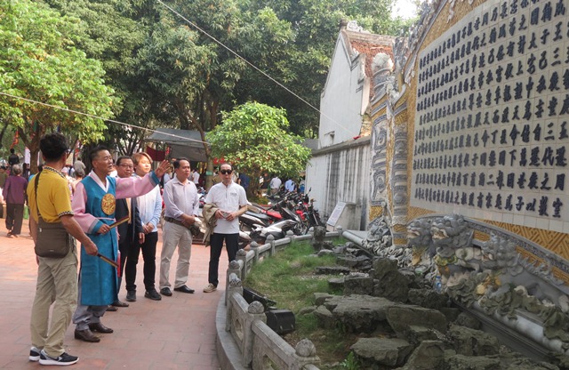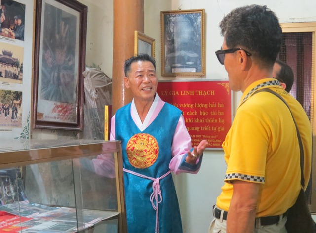 | Ông Lý Thừa Vĩnh thông tin cho đoàn về các tư liệu lịch sử trong nhà trưng bày các hiện vật về các vị Vua triều Lý. |