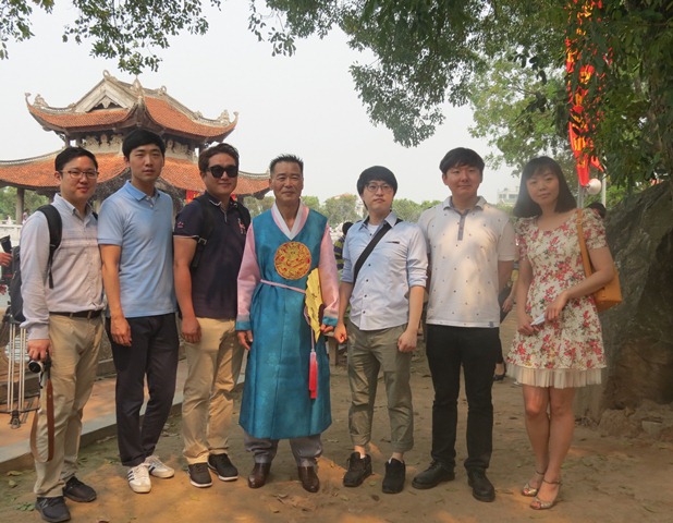 | Anh Choi Seon Ung (thứ ba từ phải sang) và nhóm bạn Hàn Quốc chụp ảnh cùng đại diện dòng họ Lý Hoa Sơn. |